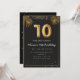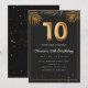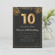 Adorable 10th birthday party invitation in a black and gold balloons design with golden tropical palm leaves. Customize with your party details and mail out to family and friends inviting them to celebrate the 10th birthday with style!