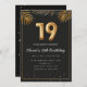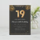 Adorable 19th birthday party invitation in a black and gold balloons design with golden tropical palm leaves. Customize with your party details and mail out to family and friends inviting them to celebrate the 19th birthday with style!