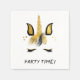 Sweet unicorn face with gold ears, mane, horn and stars.  "Party time" text can be left as-is or customized with a name or special message.