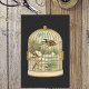 Cette image vintage a une jolie scène paysage de ruisseaux d'hiver avec un cabine et un oiseau sur une branche à l'intérieur d'une cage dorée d'oiseaux. L'arrière - plan est noir. Voir mon magasin Art by MAR pour apparier les produits avec ce design.