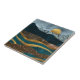 A captivating abstract landscape ceramic tile featuring layered golden and teal waves flowing across the foreground, contrasted with dark mountains and silver textures. A glowing golden sun rises (or sets) behind the peaks, casting a serene and mystical atmosphere. Rich textures of foil, glitter, and marble-like surfaces bring depth and elegance, making this design perfect for those who love modern, nature-inspired, and luxurious styles.