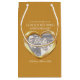 Personalize this Golden wedding anniversary photo gift bag with your favourite photos own message and year of marriage. Currently reads To my dearest wife on our Golden Wedding Anniversary 15th August 1975 to 2025, this can be personalized to your own words and receiver. Ideal to fill with your choice of two photos for a unique way to give a special golden anniversary gift to your wife, husband or a special present to the happy couple to celebrate 50 years of marriage. © Original graphic art and design by Sarah Trett.