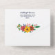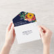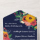 Charming floral all in one wedding invitation in navy blue with white fonts and colourful flower arrangements in golden yellow, pink, orange, and red with greenery and berries. The other side of the invitation, which will feature as an envelope, is white with another beautiful flower arrangement beneath the return address.