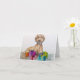 A perky Goldendoodle lies surrounded by birthday presents. Who are they for? The Goldendoodle or you!