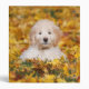 Goldendoodle Puppy sitting in Fall leaves.