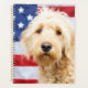 Goldendoodle sits proudly in front of the American flag on Memorial Day.