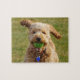 This beautiful puzzle features a cute photo of an adorable goldendoodle playing fetch with a tennis ball at the park. Photography created by award-winning photographer Maria Jeffs.