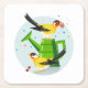 Goldfinch pair sitting together in the garden, with one perched on a watering can and both diligently gathering berries, makes a lovely and vibrant design on a coaster. Adding a touch of nature's beauty and the charm of these small birds to any table or setting.
