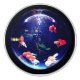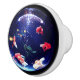 Goldfish bowl with orange and white goldfish swimming about and tiny, sparkely bubbles in the water. In colours of blue, orange, white and black.