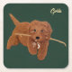 A paper coaster with a cute image of a Golden Doodle. The background, image and text can be personalized. Original artwork by W.B.