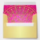 This exotic hot pink and gold A7 envelope has a large central gold scroll circle medallion pattern on the inside with ornate swirled hearts detailing and gold stars and dots that lay over top of a fuchsia pink background with another layer of fine bright lavender purple swirls and scrolls on it that match the Indian inspired wedding and engagement invitations shown below. Customize it with your own return address. If you want to change sizes, please email niteowlstudio@gmail.com to have one made up.