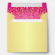 This exotic hot pink and gold envelope has a large central gold scroll circle medallion pattern on the inside with ornate swirled hearts detailing and gold stars and dots that lay over top of a fuchsia pink background with another layer of fine bright lavender purple swirls and scrolls on it that match the Indian inspired wedding and engagement invitations shown below. Customize it with your own return address. If you want to change sizes, please email niteowlstudio@gmail.com to have one made up.