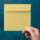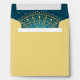 This square teal and goldtone envelope has a large central gold scroll circle medallion pattern on the inside with ornate swirled hearts detailing and gold stars and dots that lay over top of a dark teal blue background with another layer of fine bright aqua blue swirls and scrolls on it that match the Indian inspired wedding and engagement invitations shown below. Customize it with your own return address. If you want to change sizes, please email niteowlstudio@gmail.com to have one made up.
