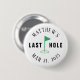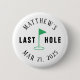 This custom button features the playful phrase "Last Hole" along with a golf flag image, making it a fun accessory for a golf-themed bachelor party. Personalize it with the groom's name and date for a unique and memorable touch. Ideal for the groom and his friends, this button adds a humourous and personal element to any pre-wedding celebration.