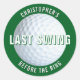 Take it to the fairway with this last swing before the ring bachelor party sticker. Designed with a golf ball, it's perfect for sports fans, club members, and players. Personalize it with the groom's name for a custom keepsake that is sure to putt in it down.