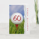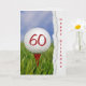 white golf ball on red tee in grass and blue sky background with torn edge border for 60th birthday