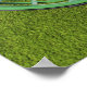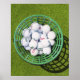 Golf balls in a basket sitting on short green poster