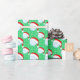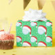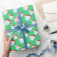 This festive Christmas wrapping paper features a golf ball dressed in Santa hats, surrounded by sparkling white snowflakes on a cheerful holiday light greeb background.