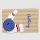 Cet accessoire est parfait pour votre sac de bowling. Cette serviette est prête à être personnalisée avec un nom en lettres de caractères bleus, et présente une illustration d'une boule de bowling et des épingles de bowling posés contre un arrière - plan rayé bronzé.