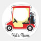 A red gold cart seen sideways, complete with bag and clubs, without people, white outline all around "sticker style"