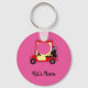A red gold cart seen sideways, complete with bag and clubs, without people,