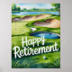 This vibrant watercolor poster captures the serene beauty of a lush golf course with the heartfelt message, "Happy Retirement," elegantly displayed on the green. The peaceful course scene, featuring rolling fairways and a clear blue sky, sets the perfect backdrop for the joyful retirement message. Personalize the design with the retiree's name or special retirement details to make it a memorable gift or decor piece that celebrates their years on the course.