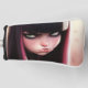 A cute, angry punk rocker girl. She has neat cut bangs, black hair with pink streaks. She has a pouty face. She has dark eye makeup and green eyes. Art style is a mix of anime and 3d.