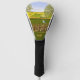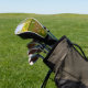 A golf head cover with a beautiful nature scene: A bird sitting on a weathered fence, wildflowers growing around the fence, a farmer on a tractor, working his land, trees with leaves, and farmland with various colours. The background, image and text can be personalized. Original artwork by W.B.