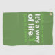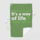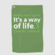 Great golf towel gift for golfers with text "Golf is not a sport. It's a way of life. Live it. Love it." A great sporty golfer's towels gift idea available in different colours for the great sport of golf playing men and women. Add your name or giftee's name to personalize.
