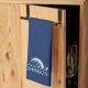 Personalized name in classic font on a navy blue kitchen towel with a ring clip and unique golf ball and golf club logo graphic design is a great golf gift or keepsake for a golfer, caddy, or golf club membership award.