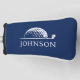 Personalized name in classic font on a navy blue putter club head cover with a unique golf ball and golf club logo graphic design is a great golf gift or keepsake for a golfer, caddy, or golf club membership award.