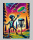 Alien extra-terrestre coloré jetant le disque golf aai coloré art.