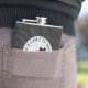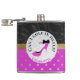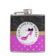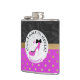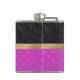 Woman's golf themed drinking flask done in a black sequence look and a pink with gold glitter polka dots, across the bottom, with a gold band, between the upper and lower backgrounds. A golf ball, on the front is decorated with a pink stiletto high heel. Black text reads, Can I gold in heels? Personalize the text and name to suit your needs. Fun gift idea.