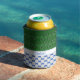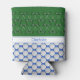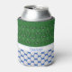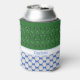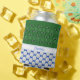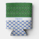 Golf balls create a bright polka dot pattern on a blue background on both the front and the back of this fun can cooler for golfing enthusiasts. On the front, golf clubs are also used in a complementary pattern on green, and there is a white stripe for you to personalize with a name or other text in matching blue.