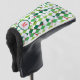 Funky modern golf head cover patterned with golf balls on a green argyle pattern background. There's a customisable monogram circle area for you to add your own initial