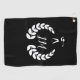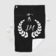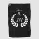 Personalized monogram golf towels with white crest and golfer clip art on black background. Great gift idea for a keen golfer.