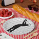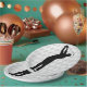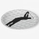 Paper party plate with image of a golf ball and a silhouette of a golfer in black and white.