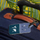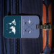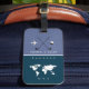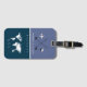 A nice and blue luggage tag for a golf player... his name, a small airplane, golf clubs, the map of the world...