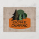 Gone Camping Logo with woods in green on orange background celebrates the Great Outdoors. Hike, fish, swim, commune with nature. Perfect gift for sportsmen and women, nature lovers, hikers, scouts and scoutmasters, or anyone who enjoys tents, campers, trailers, sleeping bags and campfires.
