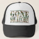 It's the classic GONE SQUATCHIN Camo text Mesh Trucker Hat! Featuring the silhouette of a Sasquatch (or Bigfoot) in the O of the word Gone. Choose from different hat colours, and grab yours today!
