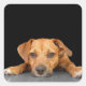 Very cute reddish-brown terrier mix dog with floppy velvety ears and soulful brown eyes resting his head on the floor. This is a very good dog.