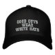 Fits well due to elastic edging, not adjustable. Good qualty material. Good quality embroidering. Subtle lettering (white on beige) just as my wife likes.