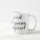 Tell your gorgeous Good Morning with this friendly mug in simple black and white script.