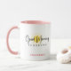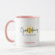 An adorable Good Morning Sunshine coffee mug or chocolate milk mug for the kids! Customize the two-tone colour! The mug is shown here in white with a pink handle. Good Morning Sunshine Script is in black over a simple, shining, yellow sun. Personalize it!