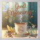 A captivating 3D render illustration of a cozy and stylish scene, with a warm coffee cup taking centre stage. The vintage bicycle, a book with fluttering pages, and the serene nature-inspired text, "Good morning" are artfully arranged around the coffee cup. The ambiance is filled with soft, golden sunlight, and natural elements like leaves and branches are integrated seamlessly. The overall composition is a blend of fashion and illustration, with a touch of vintage charm., illustration, 3d render, fashion, typography