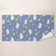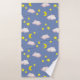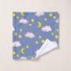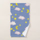 Cute kid's bath towel set features pillowy clouds, stars and moons on medium blue background