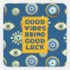 Good Vibes bring Good Luck, evil eye pattern is a fun and energetic design featuring lots of different styles of evil eye on a blue background.