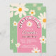 Good vibes only groovy retro daisy birthday invitation template instant download, green pink and white arch retro daisies design for groovy vibes themed party.