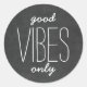 Modern and trendy motivational stickers that have a cute white typography design that says Good Vibes Only on a cool faux black chalkboard background.