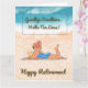 This funny retirement card features a playful, sun-kissed design with a woman sunbathing on a bright, beachy scene. Bold, cheerful lettering reads: